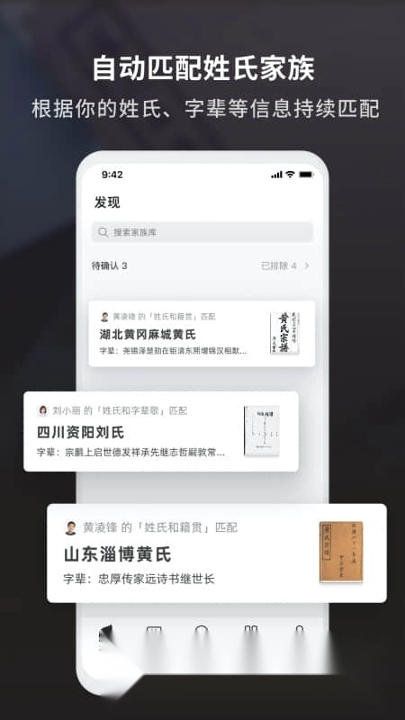 发现:系统会依据用户信息自动推荐与之匹配的家族线索,助力用户快速锁定家族的来源。