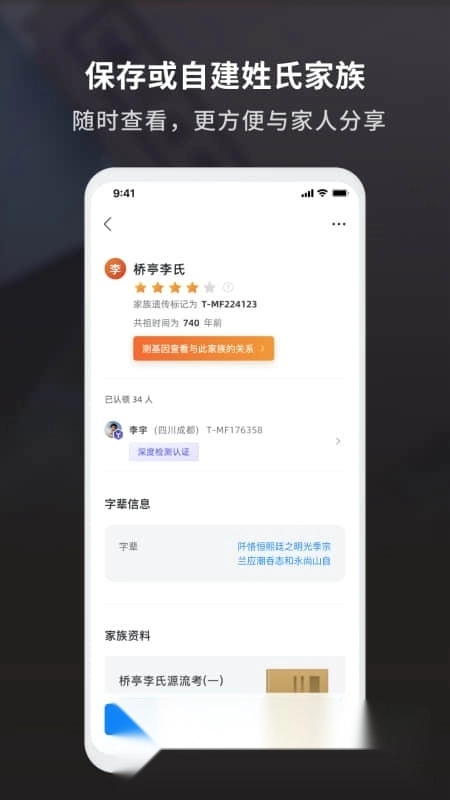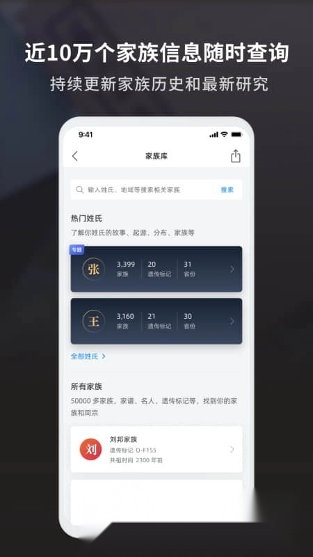家族库:可随时查询近十万份家谱与基因信息,能快速定位并留存自己所属的家族。