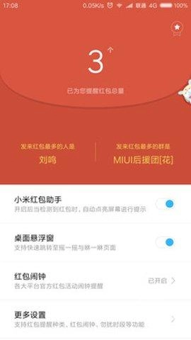 当你进入小米红包助手App时,你可以看到它提供微信群组红包声音和弹出窗口提醒。在待机屏状态下,当出现红包时,手机会发出“红包来了”的声音提醒,并自动点亮手机屏幕,以弹出窗口的形式显示红包信息。用户只需直接点击提示信息进入相应微信组即可完成抢红包。如果您使用的是手机,任何界面上方都会有醒目的通知提示和声音提醒,帮助您第一时间拿到红包。