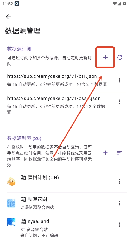 3、点击界面上的“+”号图标,准备添加属于自己的个性化源。