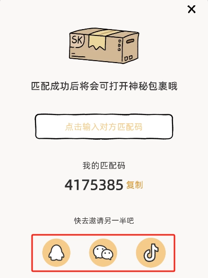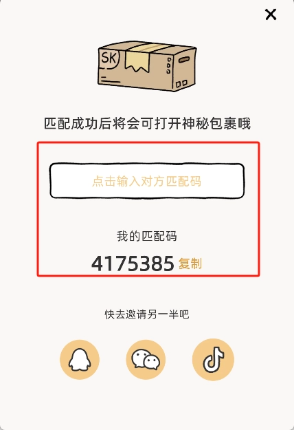 3、在弹出的匹配窗口中输入我们的另一半提供的匹配码。