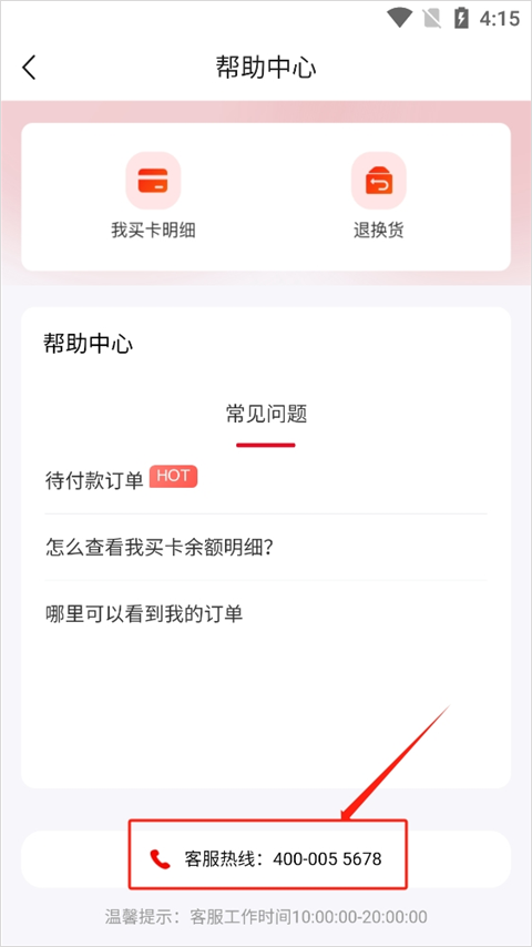 2、之后就能在帮助中心界面的最底部找到客服的联系电话了,另外要留意客服的工作时间为早上8点至晚上9点。