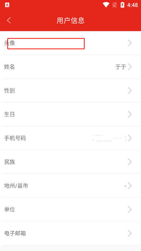 5、在该页面完善用户信息,例如头像、名字、地区、单位等内容,其中头像也需设置。