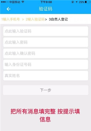 6、填写验证码、设置登录密码、确认密码、身份证号码以及真实姓名,然后点击下一步。