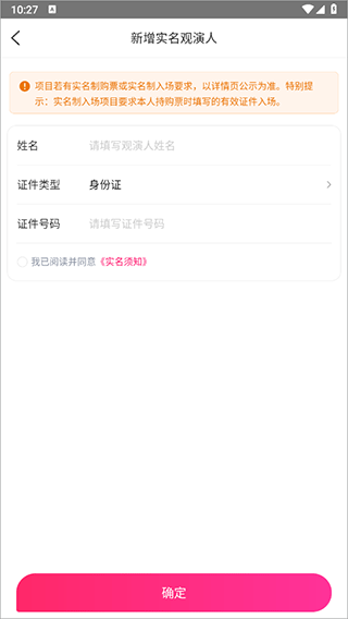 3、将观演人姓名、证件号码添加后点击确定即可