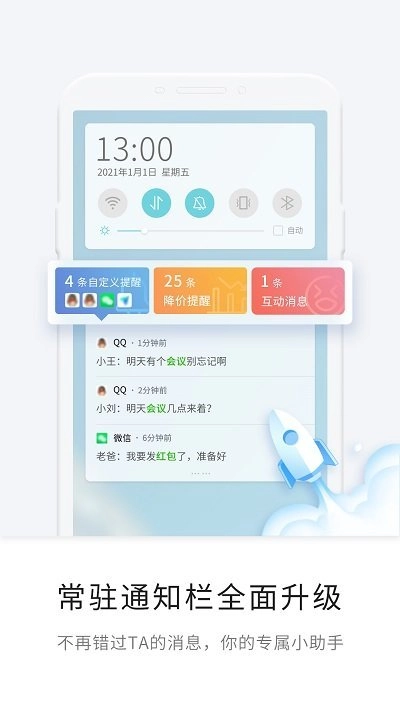 将通知快速分类,过滤拦截广告通知,并提供应用开关设置及关键词自定义设置功能满足用户个性化通知提醒需求;