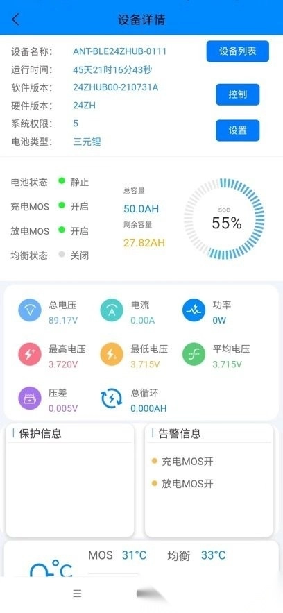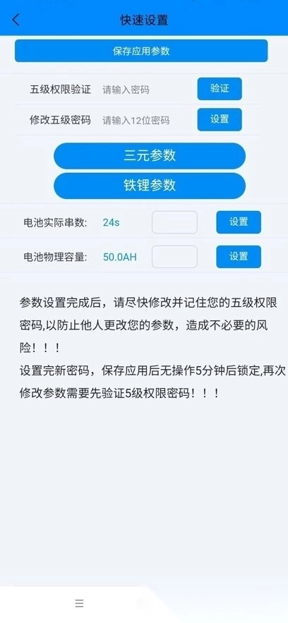 通过这款应用,用户能轻松监测电池的各项实时参数,还能对其进行灵活管理;它支持切换不同工作模式,可直接控制设备,并且能同步接收系统发出的安全预警信息;应用可以清晰呈现电池剩余电量,持续监控其运行状态,同时具备参数自定义功能,便于针对各类电池调整电流、电压等关键数值。