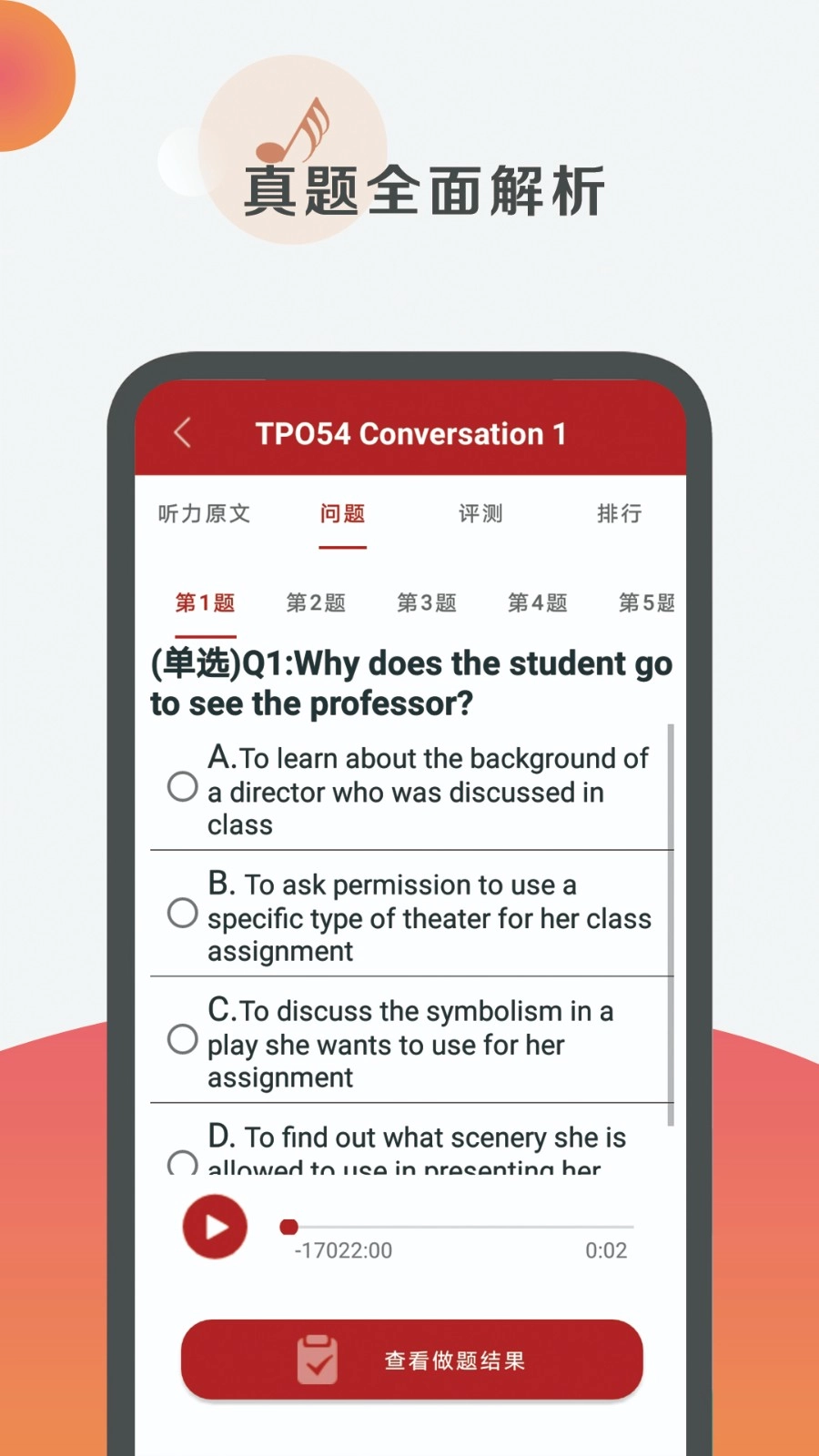 1、包含多套TPO听力,涵盖多种题型听力内容,自由练习;