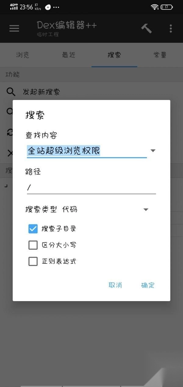 2.用dex++全选dex,搜索代码"全站超级浏览权限"