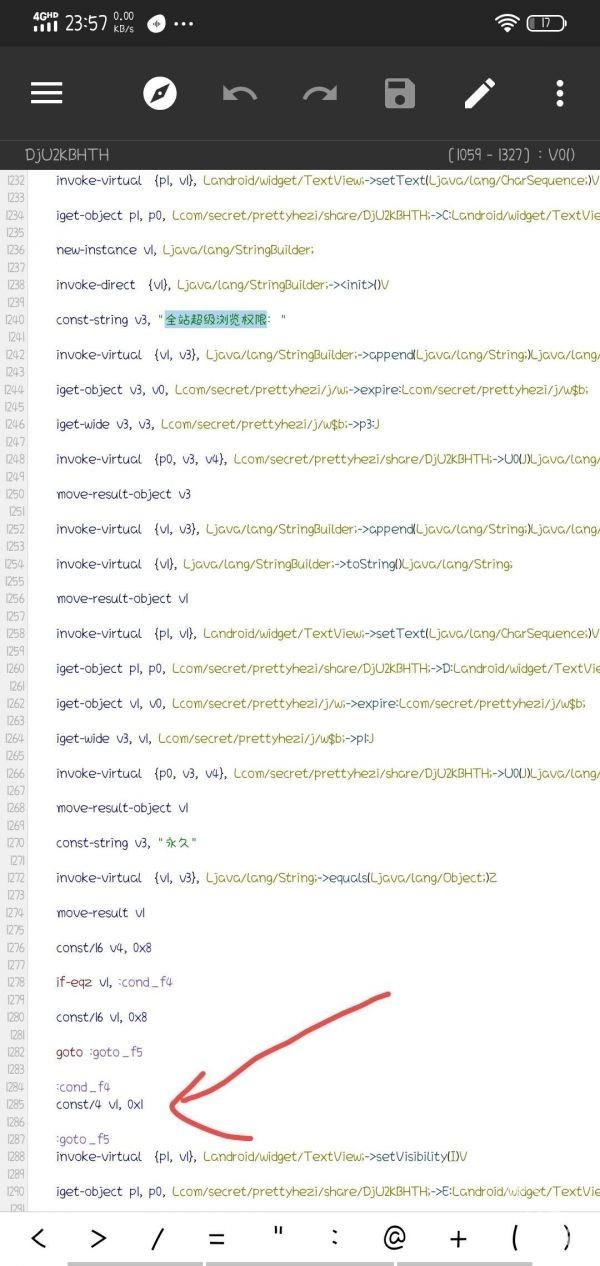 3.点击搜索到的*下面这个,向下翻到1285行,将const/4v1.0x0修改为const/4v1.0x1