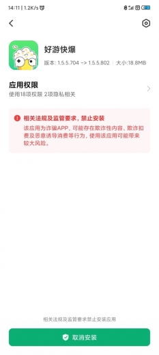 在使用小米好游快爆时,系统出现异常的拦截提示“诈骗”(如下图),导致无法好游快爆。