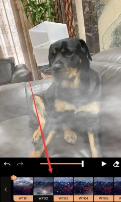 5、我们向左滑动页面,在天气分类板块下,选择第一个和第二个效果。选定后,照片上方会呈现出烟雾缭绕的效果。还可以通过调节上方的进度条来调整烟雾的强度,调节完成后,点击后方的播放特效按钮即可。