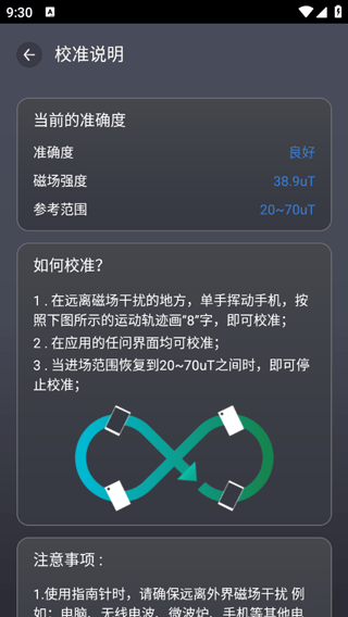 1、请在无磁场干扰的环境下,用单手挥动设备,沿着下图所示的运动轨迹画“8”字,就能完成校准操作。
